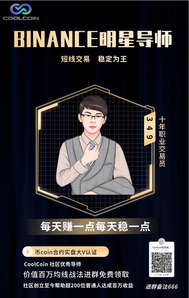 大家好,自我介绍一下,我是349,一个职业交易10年的交易员,也是BINANCE首期合约导师,币COIN认证大V,合约帝认证大V,COOLCOIN 社区优秀导师,个人实盘收益超200倍,擅长中小资金快速翻倍,自创349短线合约战法,已帮助社区数百位会员完成实盘百万收益,帮助数千位会员构建了成熟的交易系统,从亏损到稳定盈利,也收获了社区对我价值的认可,和349战法课程的认可。(扫描二维码进入社区QQ群即可免费领取价值百万的349均线战法)