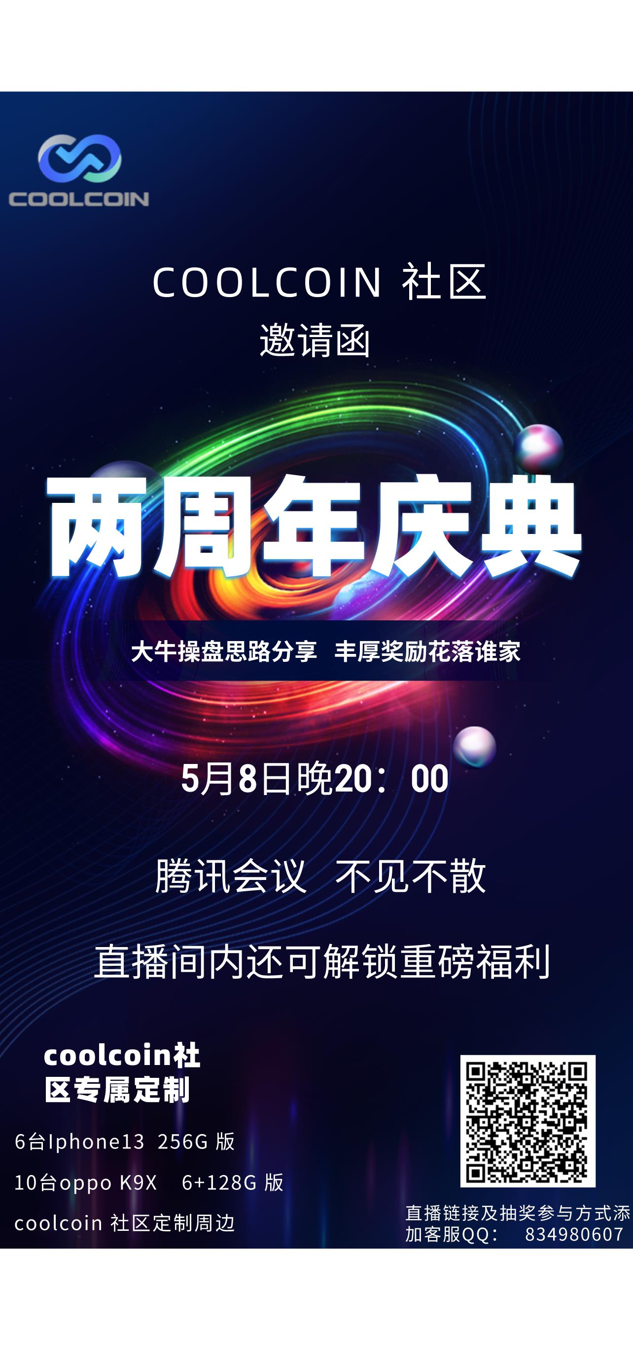 本月8号晚20:00,我们会在线上开办COOLCOIN 社区两周年庆典,诚挚邀请所有看到这篇文章的伙伴前来参与抽奖,赢取IPHONE 13 PRO,我也会邀请实盘盈利超百万的优秀学员为大家做分享,期待您的到来。(直播链接及抽奖参与方式请添加客服QQ获取)
